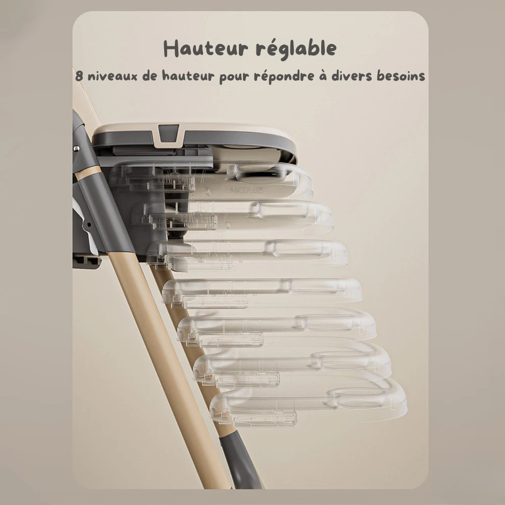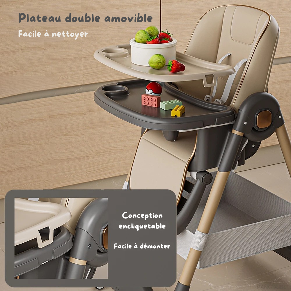 **🍽️ Plateau Double et Téléscopique : Plateau amovible à 3 positions (24, 28, 30 cm) pour s'adapter à la croissance de bébé. Surface en PP de qualité alimentaire, sûre et facile à nettoyer.